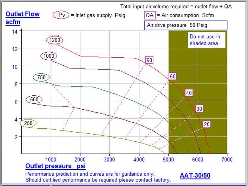 With a nominal pressure ratio of 30:1 (2nd stage ratio 50:1), the Haskel model AAT-30/50
